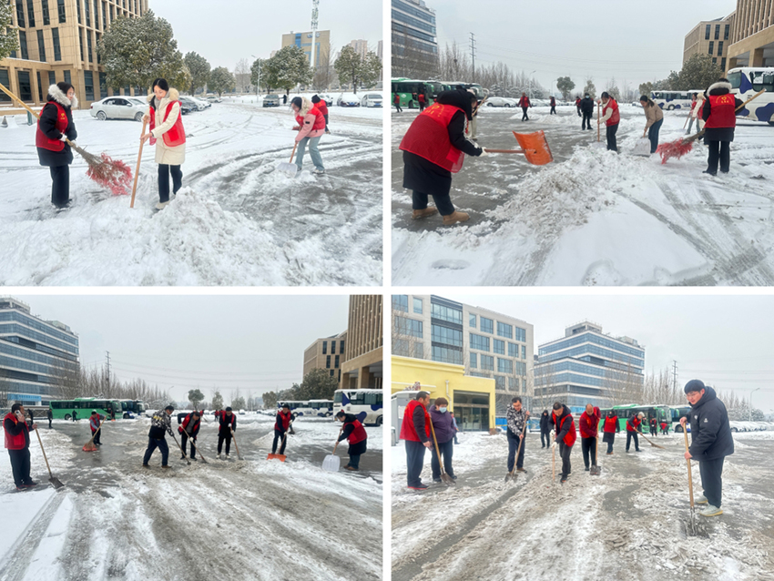 清晨寒風(fēng)刺骨,但現(xiàn)場干勁如火。大家身著醒目的紅色志愿馬甲,在皚皚白雪中迅速集結(jié),分成三個小組高效投入清雪作業(yè):一組負(fù)責(zé)集團(tuán)大樓正門前區(qū)域,他們揮動鐵鍬,一鍬接一鍬奮力破除凍結(jié)的冰層;第二組沿主干道左側(cè)推進(jìn),他們手持掃帚與鏟子,細(xì)致清掃積雪、疏通通道;第三組則專注右側(cè)區(qū)域,他們默契配合,有人撒布融雪劑、有人鏟雪、有人及時掃雪,確保臺階和坡道防滑安全。沒有雪板,就用鐵鍬推、用掃帚攏;冰層太硬,就輪番上陣、接力攻堅。盡管寒風(fēng)凜冽、鞋襪濕透、雙手凍得通紅,卻無一人退縮。鐵鍬撞擊地面的鏗鏘聲、掃帚劃過雪面的沙沙聲,匯聚成冬日里溫暖有力的奮進(jìn)旋律。